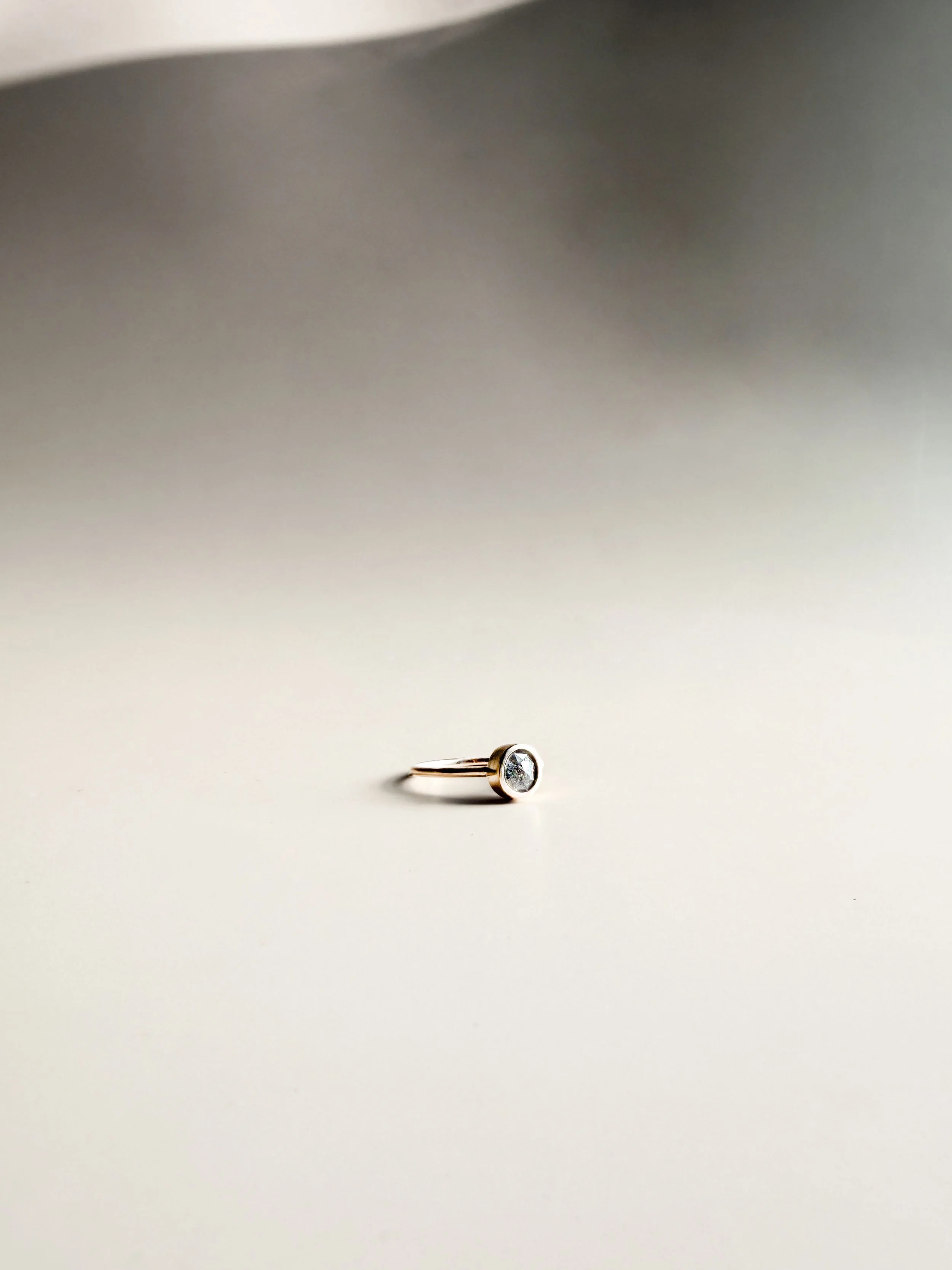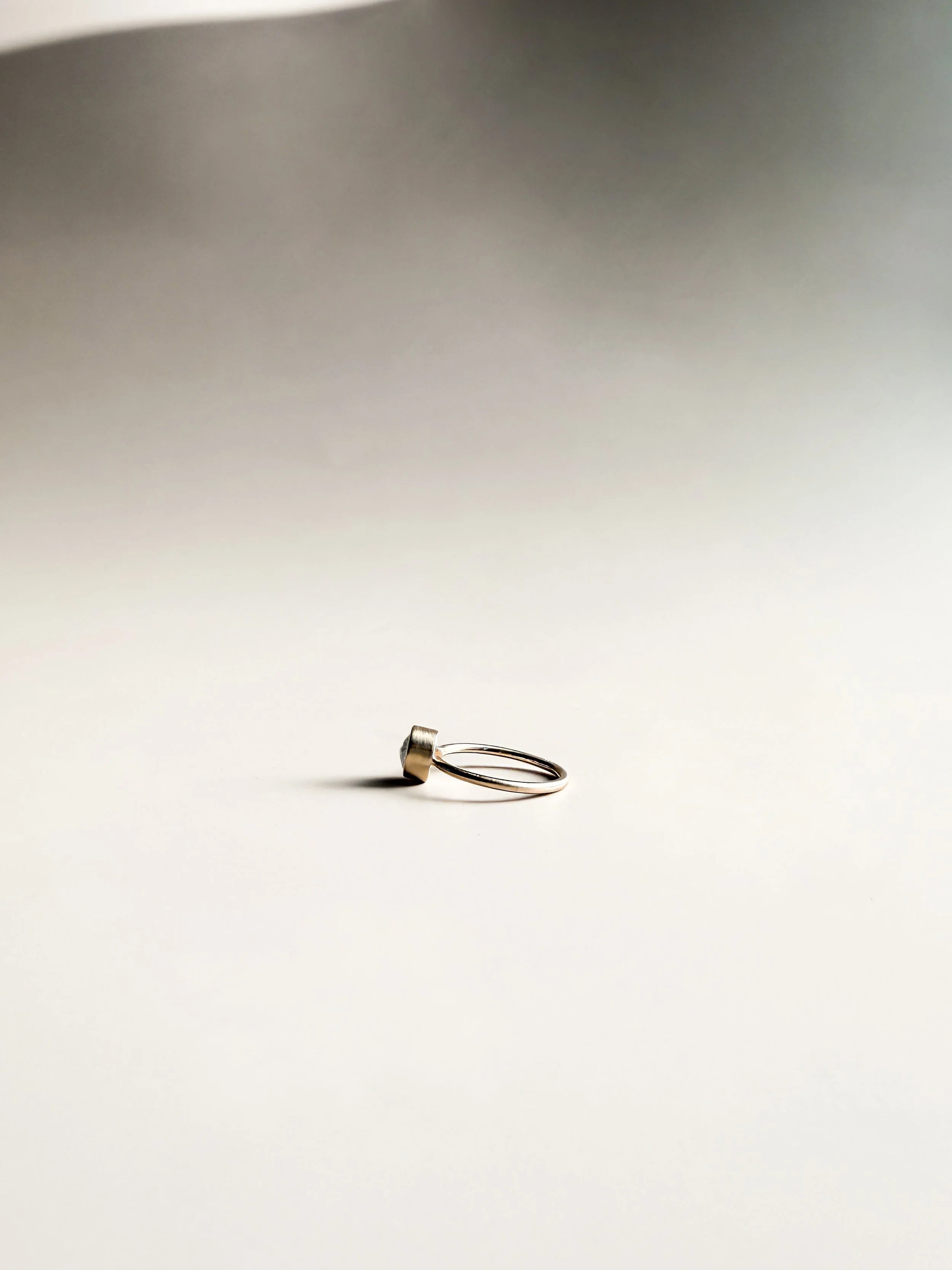The Yui Ring in Labradorite reflects the mysterious beauty of changing light — flashes of blue, green, and gold dancing beneath a smoky gray surface. Each stone holds its own universe, glowing softly like moonlight through mist.